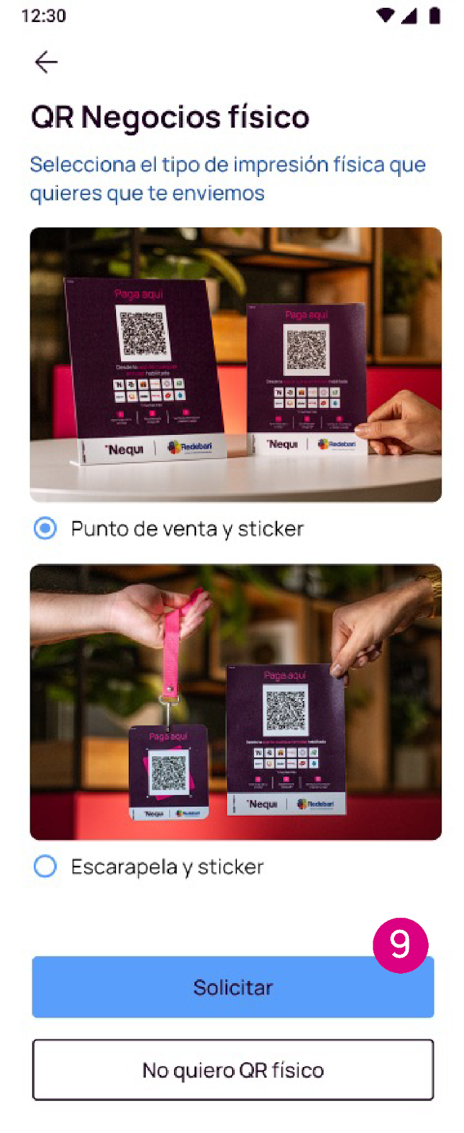 Por seguridad, siempre añadiremos al nombre de tu negocio tu primer nombre y apellido. Si en algún momento deseas cambiar el nombre de tu negocio, deberás hacer el proceso por nuestros canales de atención. - Si en la información de tu negocio seleccionaste que tienes un punto de venta físico, elige el tipo de QR físico que quieres recibir en tu negocio y dale “Solicitar”.