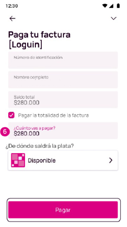 - Ingresa el valor que deseas pagar, puedes elegir entre un valor parcial o “Pagar la totalidad de la factura”, escoge si la plata saldrá de tu “Disponible” o de un “Bolsillo” y presiona “Pagar”. En este enlace conoce el monto que puedes pagar.
