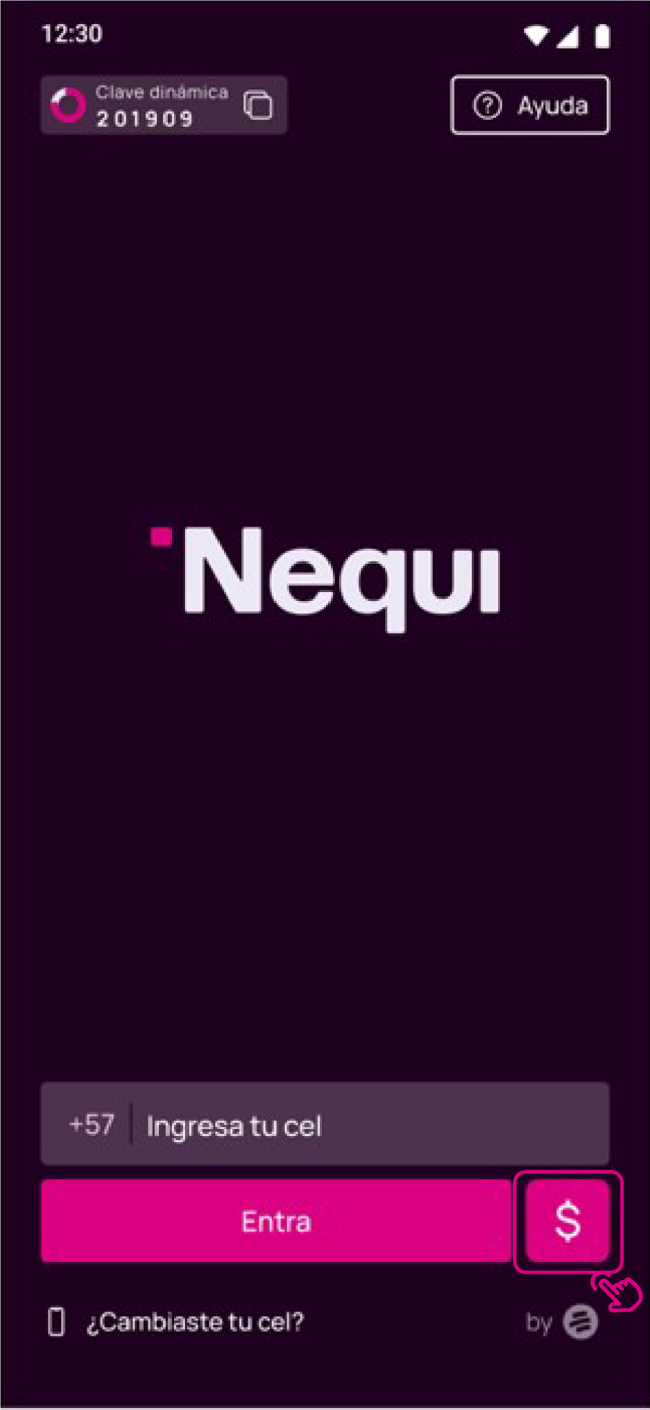 - Abre la app Nequi y sin iniciar sesión, selecciona el signo pesos “$”.