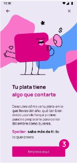 3. Una vez ingreses, ves en la pantalla “Tu plata tiene algo que contarte”. Elige “Empieza aquí” y te mostraremos el producto que más utilizaste. Luego, haz clic en el icono de la flecha.