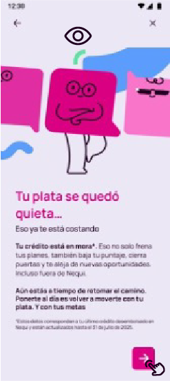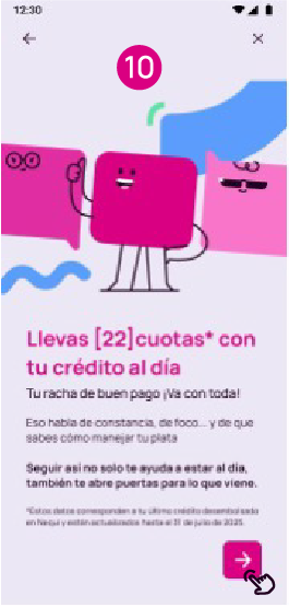 10. Si has tenido crédito con Nequi te mostraremos su estado. Elige el icono de la flecha. La información se muestra con una fecha límite de corte y si hiciste un pago después, tranquilo, se abonó a tu crédito, pero no lo vas a ver en este resumen.